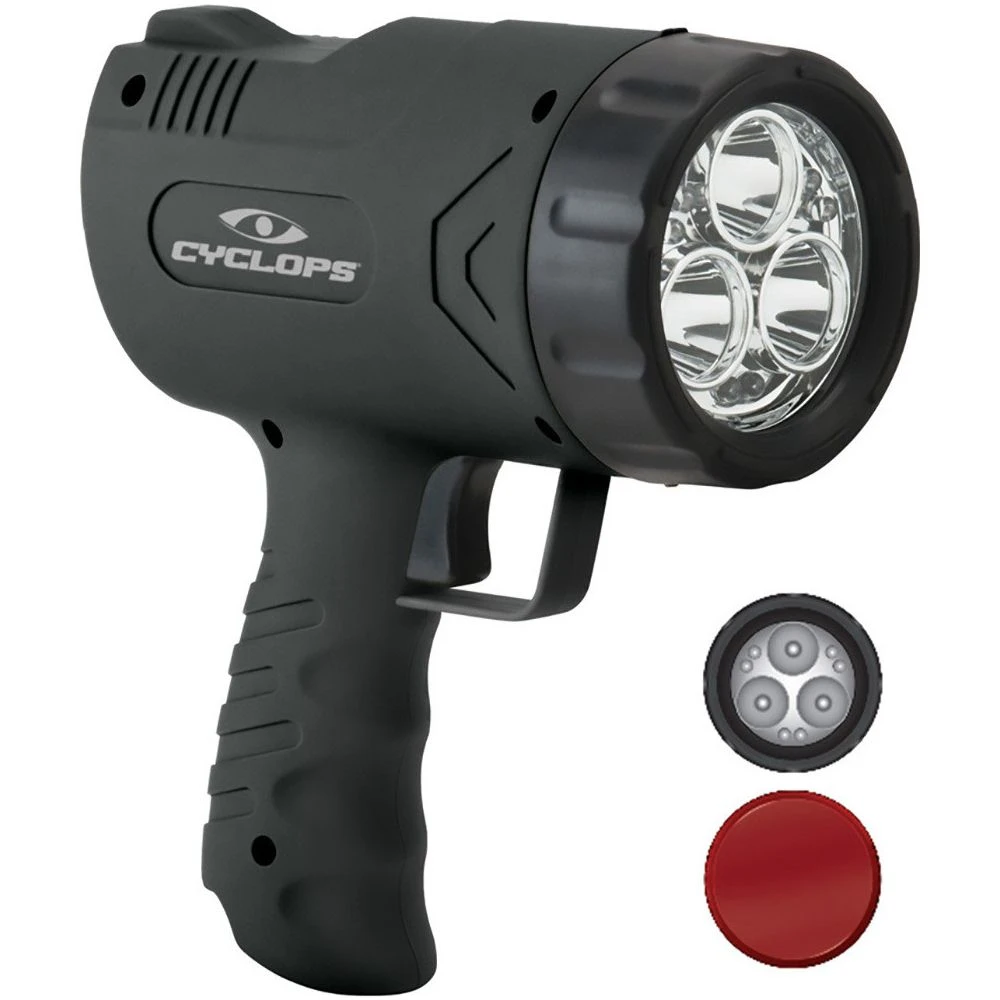 Cyclops CYC-X500H SIRIUS 500-Lumen Handheld Rechargeable Spotlight with 6 LED Lights; 500 lumen; 3 white Cree high-power LEDs for long range provide more than 4 hours burn time; 6 white LEDs for immediate area use provide more than 12 hours burn time; Ergonomically designed rubberized grip with trigger pulse switch; Always on lock switch; Includes 6-Volt 2.5Ah SLA battery, home AC charger, 12-Volt DC car charger and detachable red lens.