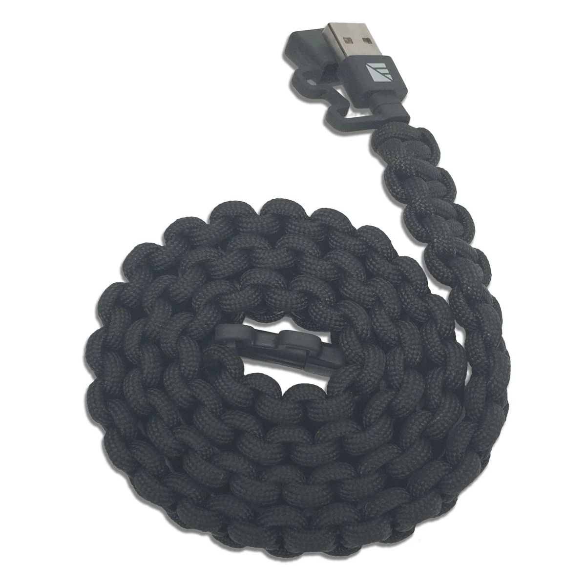 The Dark Energy Paracord Charging Cable kicks all other charger cables to the curb. Not only is it rugged, but it comes wrapped in over 20 feet of paracord (divided into two ten-foot strands). This paracord phone charger works phenomenal and they even give you two feet of cord making it easily accessible while wearing a pack or getting to your device. Pick one up and experience a charger that works and is built to last longer than a month.