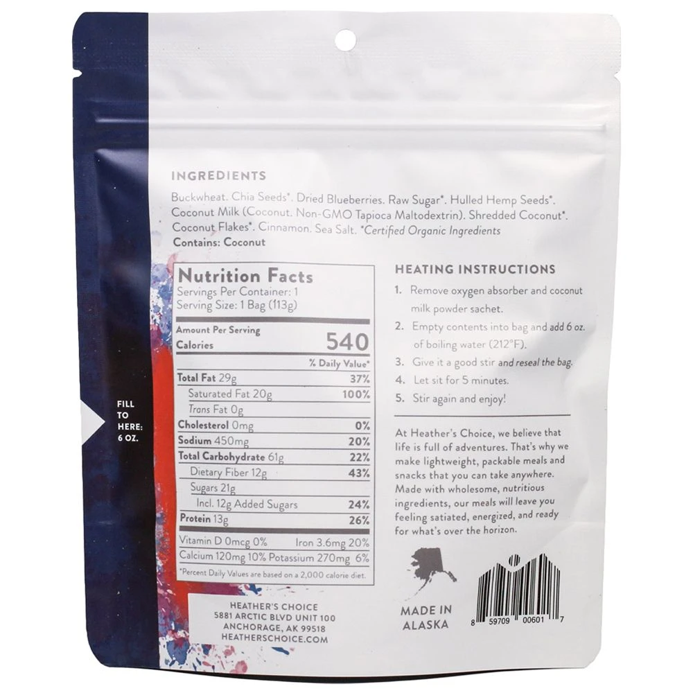Because of Heather’s Choice affinity for wild blueberries, it was only natural to add a Blueberry Cinnamon Buckwheat Breakfast to Heather’s Choice menu of backpacking foods. Their most popular dehydrated backpacking breakfast, they’re sure you will love this meal on a cold morning in the tent. This is Heather’s personal favorite and comes along on every backcountry trip.