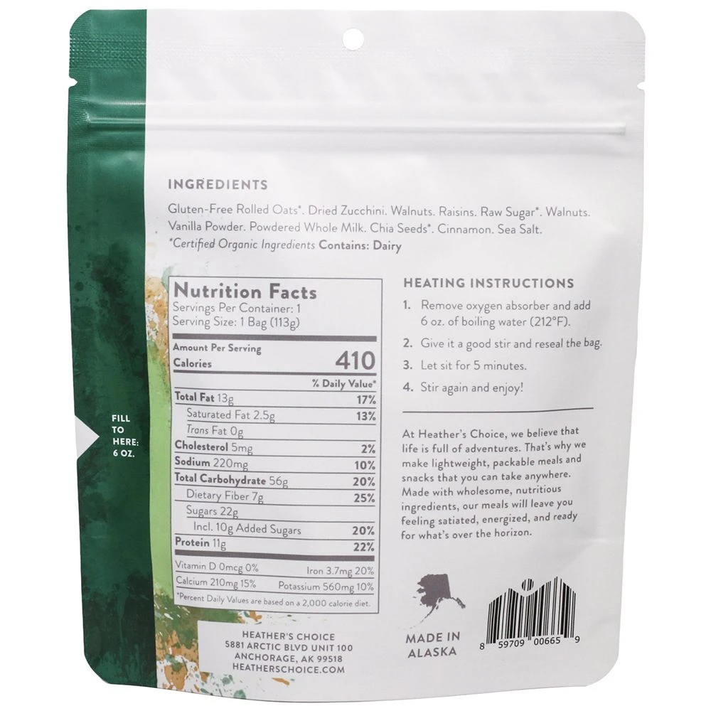 - Ingredients: Gluten-Free Rolled Oats*. Dried Zucchini. Walnuts. Raisins. Raw Sugar*. Vanilla Powder. Powdered Whole Milk. Chia Seeds*. Cinnamon. Sea Salt.