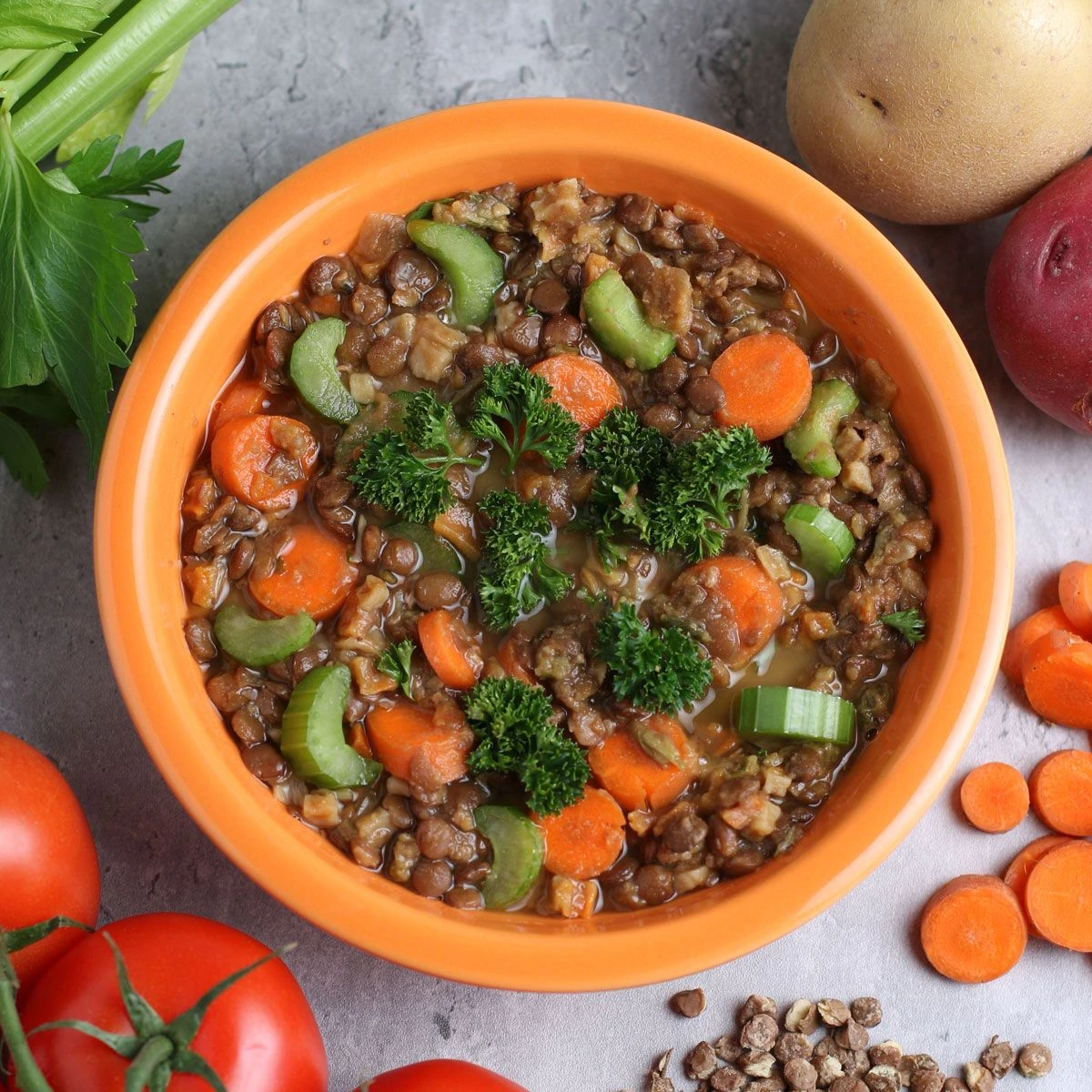 - Ingredients: Water. Dried Lentils. Onion. Dried Carrots. Dried Potatoes. Tomato Paste. Dried Celery. Olive Oil. Garlic. Sea Salt. Nutritional Yeast. Minced Garlic. Garlic Powder. Sea Salt. Onion Powder. Celery Salt. Cumin.