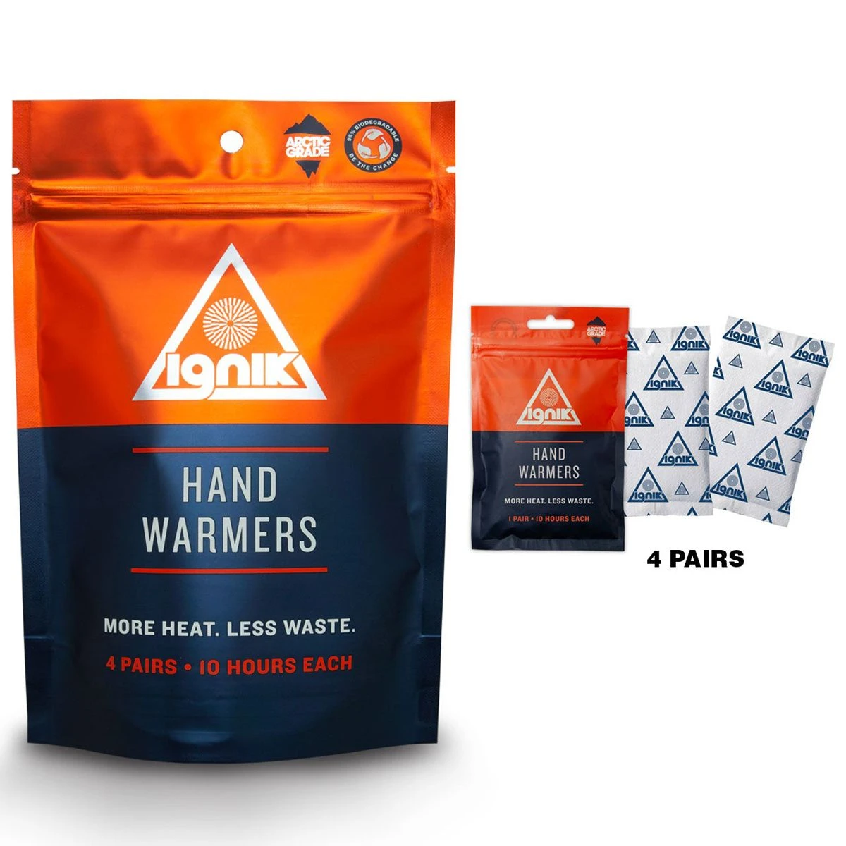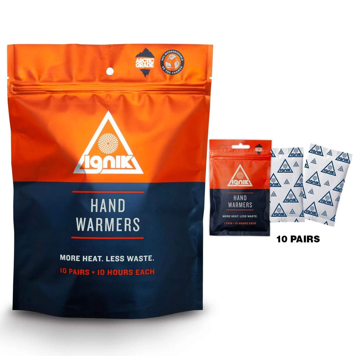 Ignik Hand Warmers are Arctic Grade, designed to solve the biggest problems you face with cheaper air-activated warmers; providing reliable, consistent, and long-lasting heat when you need it and with less waste.  We start with the highest quality, naturally active ingredients. The contents are safe, all-natural, and biodegradable. Our Patent Pending AirBarrierâ„¢ pouch keeps more air out for more reliable heat – up to 10 hours each, more heat than the leading brands. The resealable top gives you control to use the warmers when you need them. Store unused open warmers for up to 72 hours later.  The outer pouch is re-usable and 100% recyclable. The end result is a higher performance hand-warmer, which is more efficient and less wasteful.Â