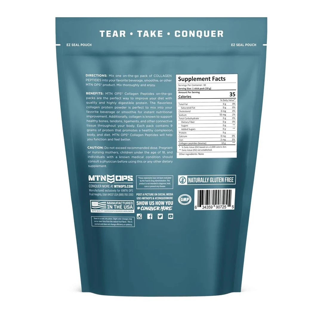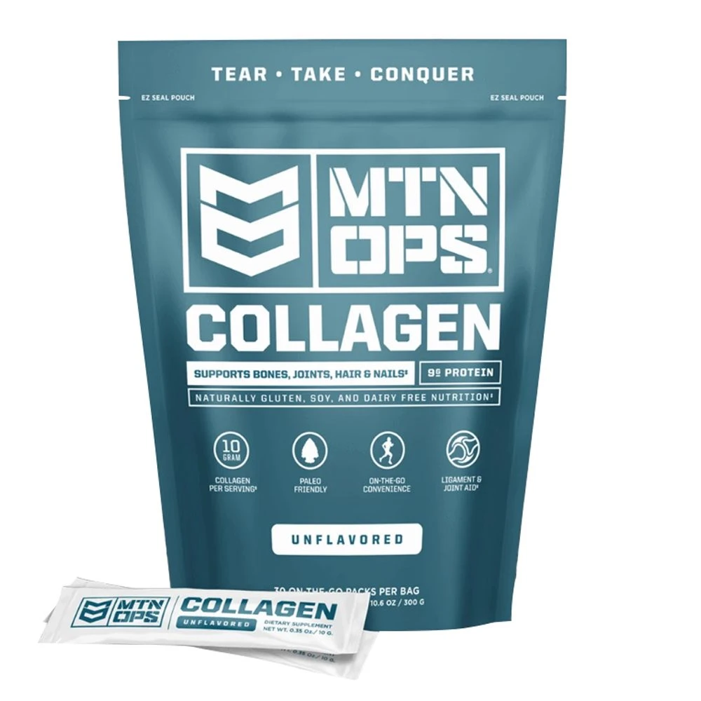MTN OPS Collagen on-the-go packs are the perfect way to improve your diet with highly digestible protein. The flavorless collagen protein powder is perfect to mix into your favorite beverage or smoothie for instant nutritional improvement. Additionally, collagen is known to support healthy bones, tendons, ligaments, and other connective tissue throughout your body. Each pack contains 9 grams of protein that promotes a healthy complexion, body and diet. MTN OPS Collagen will help you function and feel better.