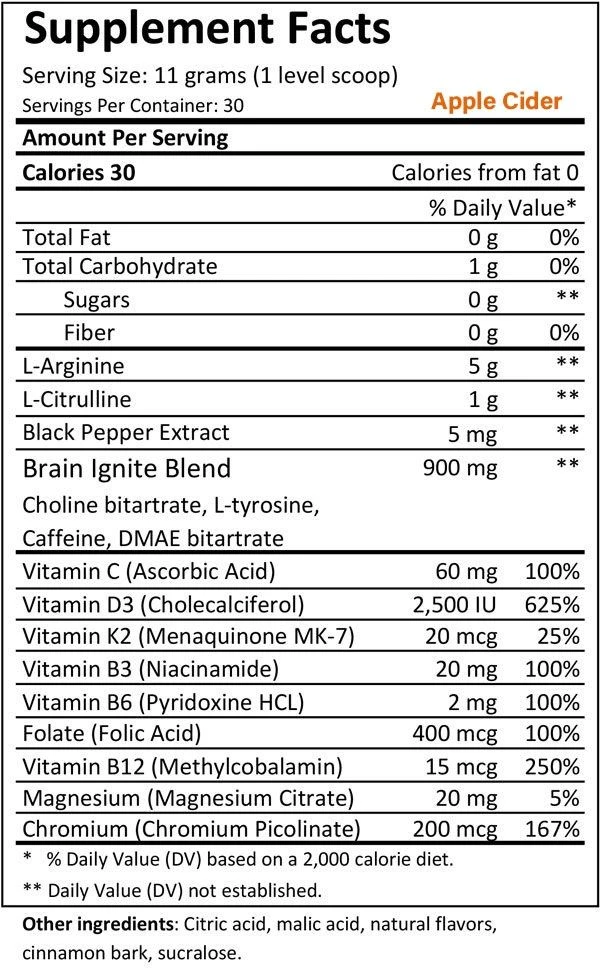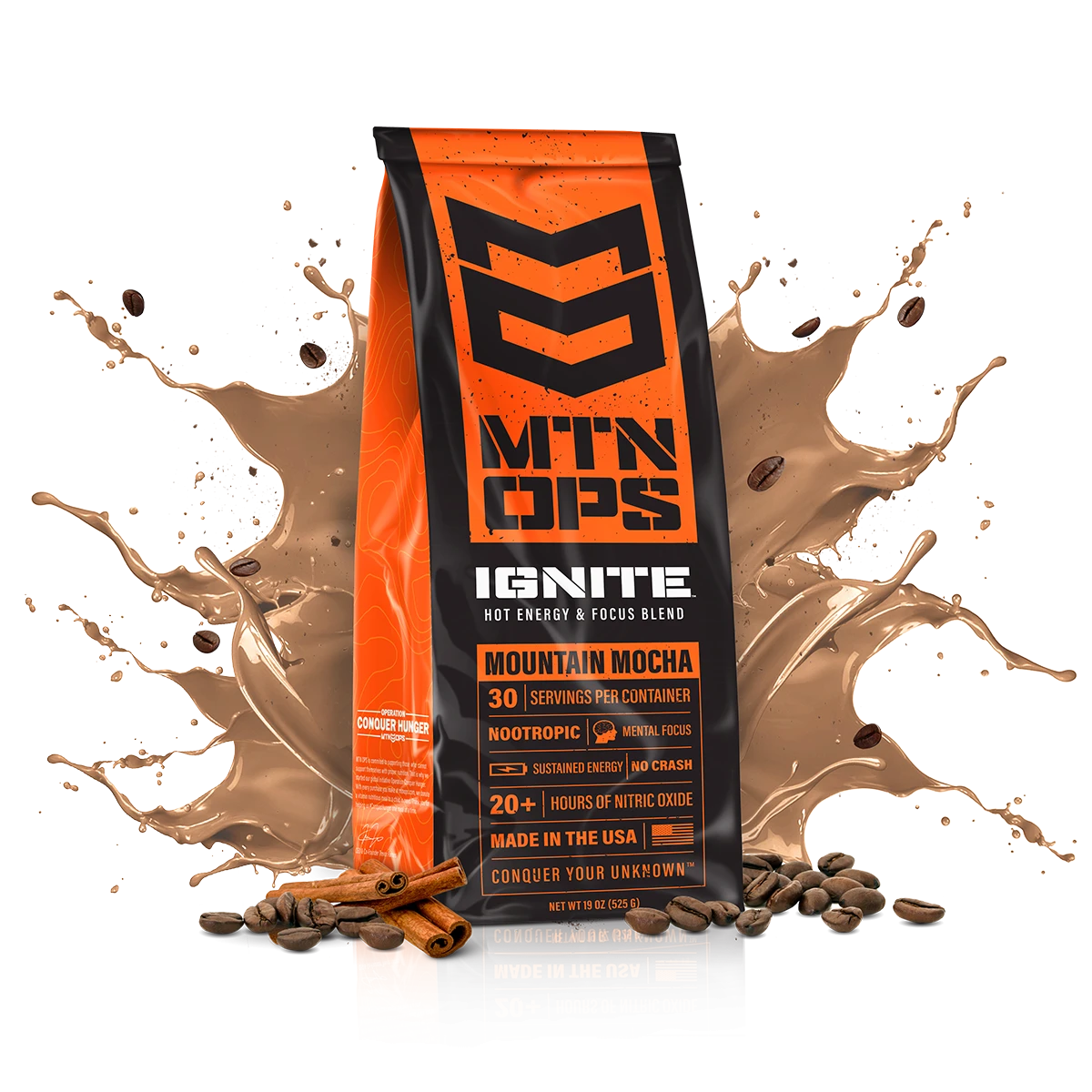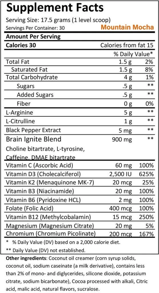 USAGE: Mix one serving (1 scoop) of MTN OPS IGNITE in 10-16 oz of water. Best used to jump start your day as a replacement for your coffee, immediately before or during a hike, hunt, strenuous activity, long day in the office, to keep up with kids at home or anytime your brain or body needs a little boost in energy, function and mental sharpness.