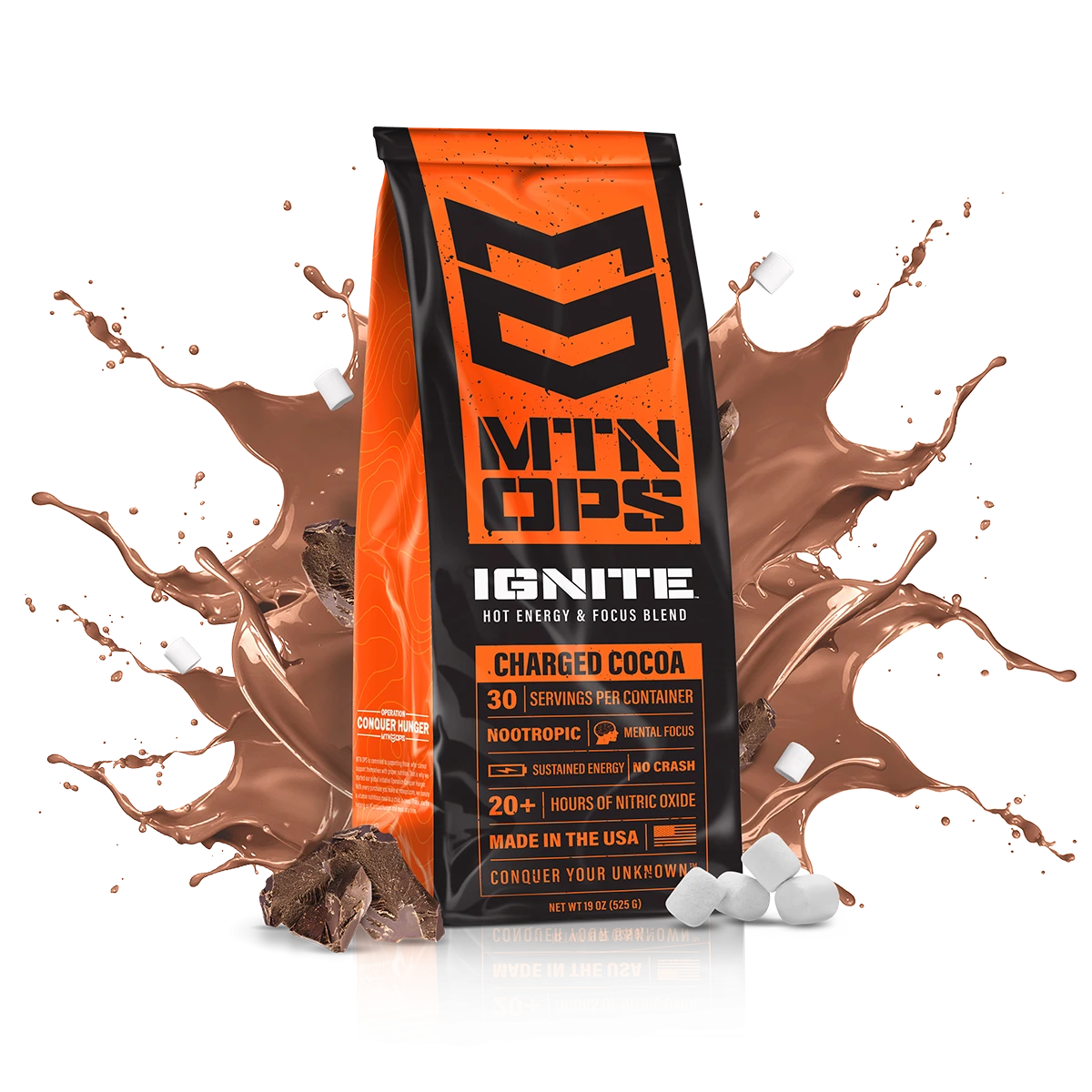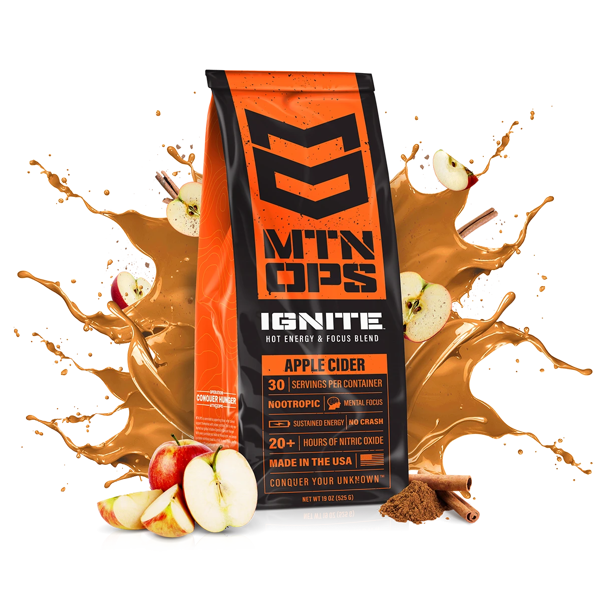 Awaken your body and mind with MTN OPS Hot Ignite. Get the most out of your training and maximize your overall performance by ensuring that both the mind and body are properly fueled. 900 mg of Ignite brain blend includes; Choline Bitartrate, Ly-Tyrosine and DMAE Bitartrate to improve cognitive function, resulting in elevated mental acuteness and clarity. Additionally, using the amino acid L-Citrulline, Ignite delivers 20+ hour release of Nitric Oxide providing smooth, long lasting energy as well as improved hydration, faster recovery and no jitters or crash. Whether you are starting the morning in camp, need a mid-day bump during a cold hunt or just enjoy a delicious warm drink to start your day, Ignite your mind and body and feel the difference today.