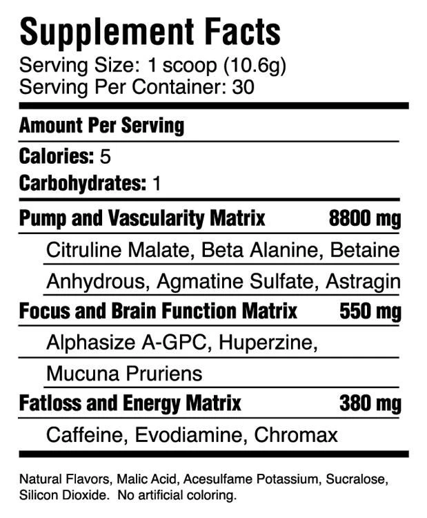 - Fatloss & Energy Matrix: 380 mg (caffeine, Evodiamine, Chromax)